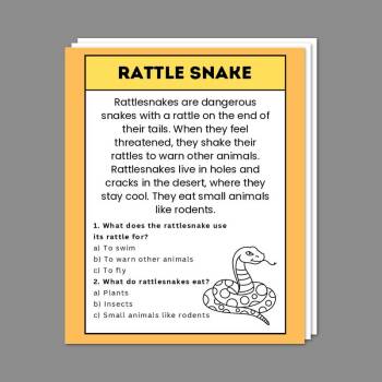 In this worksheet, students learn about the rattlesnake’s unique ability to warn predators with its rattling sound. The description also explains how rattlesnakes use camouflage to blend into the desert environment. Comprehension questions focus on the snake’s physical characteristics, such as its rattle and its diet of small animals. This worksheet encourages students to think about the importance of defense mechanisms and how they help the rattlesnake survive.