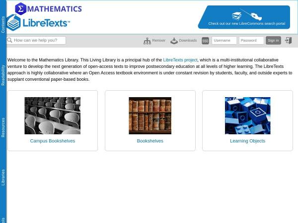 Welcome to the Mathematics Library. This Living Library is a principal hub of the LibreTexts project, which is a multi-institutional collaborative venture to develop the next generation of open-access texts to improve postsecondary education at all levels of higher learning. The LibreTexts approach is highly collaborative where an Open Access textbook environment is under constant revision by students, faculty, and outside experts to supplant conventional paper-based books.