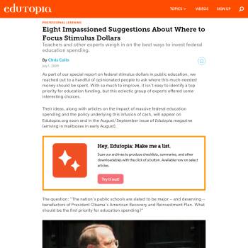 As part of our special report on federal stimulus dollars in public education, we reached out to a handful of opinionated people to ask where this much-needed money should be spent. With so much to improve, it isn't easy to identify a top priority for education funding, but this eclectic group of experts offered some interesting choices.