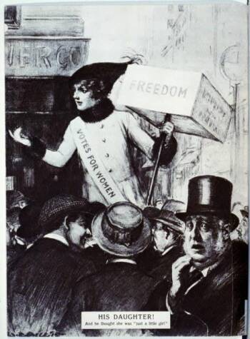 Political cartoon that depicts a shocked father and his daughter advocating for women's rights. His Daughter! And he thought she was a "little girl." Explore more.