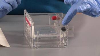 A lab technician demonstrates how to prepare an agarose gel for electrophoresis. She also provides tips on correctly filling the electrophoresis tank.