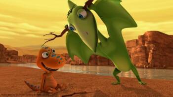 In this episode of Dinosaur Train , the Pteranodon family goes to the Big Pond for an overnight camping trip, where they meet a small frog with a big voice.