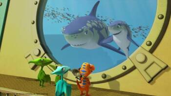 In this Dinosaur Train episode, the Pteranodon family takes the train underwater to meet Carla Cretoxyrhina, a young shark much nicer than her reputation suggests. The Pteranodon family learns that the Cretoxyrhina--a prehistoric species of shark which has been around since the Cretaceous period--uses their sense of smell to hunt.