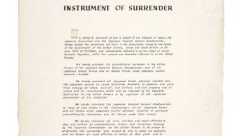 This resource group contains two facsimiles and a transcript of, and a background essay on the Japanese surrender to the Allied Forces, signed aboard the USS Missouri on September 2, 1945 by Japanese envoys Foreign Minister Mamora Shigemitsu and General Yoshijiro Umezu. This act officially ended World War II.
