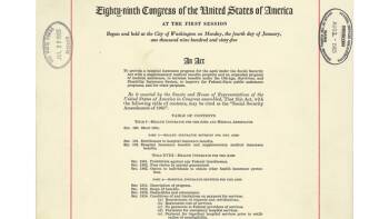 This resource group contains two facsimiles and a transcript of, and a background essay on the Social Security Act Amendments of 1965. This legislation, signed into law by President Lyndon Johnson on July 30, 1965, established Medicare, a health insurance program for the elderly, and Medicaid, a health insurance program for the poor.