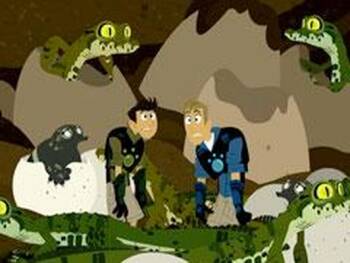 Join Chris and Martin for an inside look at a crocodile hatching from underneath the ground in the nest. Watch the episode from 15:53-18:24 to see firsthand how the baby crocs are born and start their lives. Viewers learn that crocs break through the eggs, use a calling noise to get the attention of their mother to dig them out, and then are scooped up into the mother's mouth to be carried to the water!