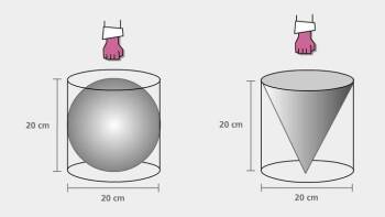 Squash cones and spheres to compare their volumes to similar cylinders and look for patterns. This interactive exercise focuses on comparing volumes between figures that have the same height and diameter and drawing conclusions based on the ratios of the sizes.