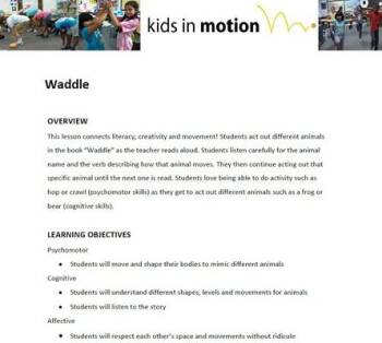 This lesson connects literacy, creativity and movement! Students act out different animals in the book “Waddle” as the teacher reads aloud. Students listen carefully for the animal name and the verb describing how that animal moves. They then continue acting out that specific animal until the next one is read. Students love being able to do activities such as hop or crawl (psychomotor skills) as they get to act out different animals such as a frog or bear (cognitive skills).