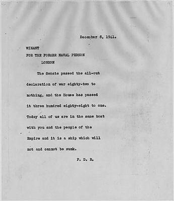 Click on the image to read a letter written by United States President Franklin Delano Roosevelt to the British Prime Minister, Winston Churchill, regarding America's entrance into World War II the day after the attack on Pearl Harbor in 1941.