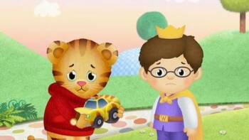 Daniel isn't sure about sharing his toy car with Prince Wednesday. Teach kids that sharing and taking turns is important. You can help them become more comfortable with this idea by playing board games with them that require turns.