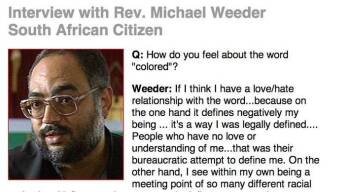 This is an interview with Rev. Michael Weeder, a South African man who was involved in the fight against apartheid. Reverend Weeder discusses his feelings on the word "colored," black culture in America during the 70s, the struggle for equality in voting rights and the benefits of non-violent protesting. The interview is from the WGBH production People's Century: "Skin Deep."