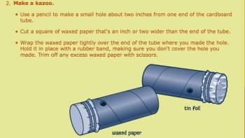 All sound is made up of vibrations (rapid back-and-forth movement), which produce sound waves that travel through the air to our ears. When you play a kazoo, air carries the sound waves from your mouth down the tube, making the waxed paper vibrate. You can feel those vibrations if you touch the waxed paper. With this "Fetch!" activity, make an instrument that anyone can play - a kazoo - and get the buzz on sound vibrations!