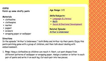 Enjoy this pants-patching game with a group of children, and then talk about dealing with embarrassment, in this activity from Arthur: "Arthur's Underwear."