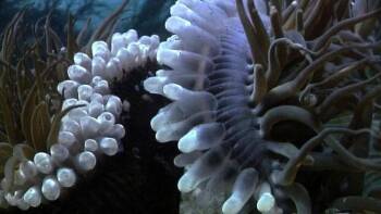 Two anemones aggressively fight using their specialized sacs loaded with nematocysts that contain toxins.
