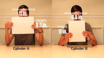 Experiment with the volume of two cylinders made from the same size paper. This interactive exercise focuses on using what you know about cylinders to make a prediction about their volume and then requires calculating the actual volume to see if your prediction was accurate.