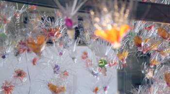 Crafted from recycled materials, Ma Li’s dream-like sculptures celebrate individual freedom, imagination and play. In Ma Li’s hands, clear plastic bottles transform into suspended fields of jellyfish-like sculptures, and colored foam and clothes hangers resemble migrating flocks of birds. With references to Chinese history, ecological concerns, ritual and fantasy, the San Francisco Bay Area-based visual and performance artist weaves unlikely materials into large-scale immersive environments, and brings them to life with choreographed movements.