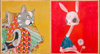 Kelly Tunstall and Ferris Plock are artists who focus on character design and development, creating a rotating cast of surreal cartoon figures inspired by visual culture, including fashion, skateboarding, Japanese regalia and folklore. They emphasize organization while maintaining freeform, both of which lead to the consistency in how their art turns out.