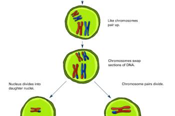 This color diagram illustrates the stages of meiosis, which is a type of cell division that results in four daughter cells. Each daughter cell contains half the number of chromosomes of the parent cell, as in the production of sperm, eggs, and plant spores.