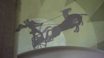 Professor Reavis Mitchell shows Elizabeth preserved and restored murals by Aaron Douglas