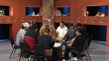The Eyabay Drum and Singing Group from Red Lake Band of Chippewa Indians in Minnesota performs with a drum while singing a traditional song.