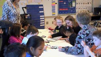 In this inclusive lower elementary classroom, a group of students are gathered around a table doing Big Paper Writing. One student interacts with the adults around her telling them that she has drawn an umbrella, which connects directly back to a story earlier in the day. She is using a comprehensive communication system to interact directly with one adult and persists in communicating that the umbrella in the picture she has drawn is open. The video demonstrates effective strategies for engaging students with significant cognitive disabilities in literacy instruction.