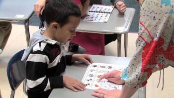 In this self-contained lower elementary classroom, a teacher has chosen the topic of the circus for students to write about in preparation for an upcoming classroom community outing. The class has exchanged ideas about what they might see at the circus and now the students will select one of these ideas to write about. The teacher provides graphic symbols as visual supports for the students to use when selecting their topics. One boy is seen using his comprehensive communication system to interact with another adult while the teacher goes around to each of the other students. The video demonstrates effective strategies for engaging students with significant cognitive disabilities in literacy instruction.
