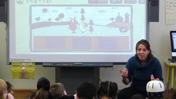 Kindergarten teacher Allison Frometa demonstrates effective strategies for wrapping up a lesson that features a Peg + Cat video and online game focused on combining shapes. She reviews the math concepts and new words students learned and encourages them to use their new skills and vocabulary at school and home.