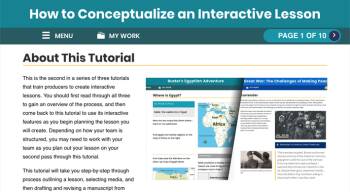 This tutorial lesson for producers takes you through the process of identifying a curricular application for media you produce, considering how to use the features of the Interactive Lesson Platform to engage students in a standards-based online learning experience, and planning for the stages of production of the lesson. It is the second in a series of three producer-training tutorials for those who plan to develop interactive lessons for PBS LearningMedia: