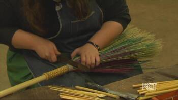 Berea College Crafts has made brooms since 1920. In this video, students demonstrate how a broom is crafted. Broomcorn is secured around the handle with wire, then a decorative checkered pattern is crafted on the handle. After the broom head is stitched, the bottom is trimmed. Last, a leather string is tied through a hole in the handle so the broom can be hung for proper storage.