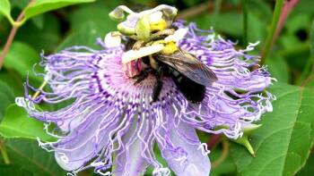 There are over 500 species of carpenter bees around the world. The Eastern carpenter bee (Xylocopa virginica) is the most common species found in the United States. They closely resemble some bumblebees, but have a shiny black abdomen while bumblebees are hairy.