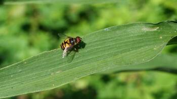 The hoverfly or drone fly (Eristalis tenax) was introduced to North America from Europe. Adult drone flies resemble drone bees. These pollinators feed on flowers from the carrot and fennel families. You’ll find drone flies in gardens, prairies, weedy habitats, and backyards.