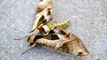 The pandora sphinx moth (Eumorpha pandorus) is native to North America and is found from southeastern Canada down through the eastern United States and west to Texas. The upper side of its wings is greenish gray with dark patches and pink streaks and the underside is yellow-green or brown.