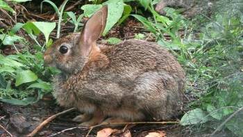 The Eastern cottontail (Sylvilagus floridanus) is the rabbit most commonly found in North America. Characterized by large front teeth, short tails, and muscular hind legs, these animals are primarily nocturnal, but can be seen moving around during the daytime as well.