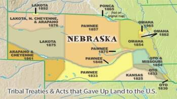 Many Native American tribes gave up land to the U.S. government during the 1800s. There were 18 separate treaties between 1825 and 1892 in Nebraska alone. By the time the Homestead Act was passed in 1862, most of the Nebraska Plains that had been promised to Native Americans for decades (and been their homes for centuries) was being sold off to homesteaders and railroad companies.