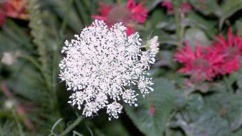 Queen Anne’s lace (Daucus carota), which grows along roadsides and fields, is a common wildflower regarded by the U.S. Department of Agriculture as a weed. Brought to the United States from Europe, where it is native, it is often called “wild carrot.” Its young root is similar to the cultivated carrot we know and eat today. It gets its name because of its delicate, white, lace-like flowers.
