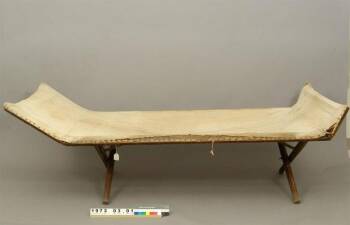 This Civil War cot or hospital bed is made of a cotton canvas nailed to a folding wooden frame. It would have been used in a field hospital, set up near a battle for wounded and dying soldiers. Folding cots like this one were strong, light, and easy to move. Cots were more comfortable for patients and cleaner than lying on mats on the ground.