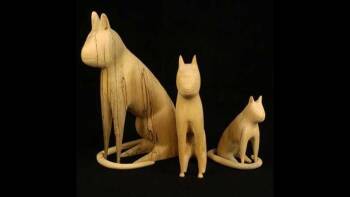Three wood cats by Linvel Barker, 1989 and 1993. (Kentucky, b. 1935.) Medium: Carved linden wood; Medium Cat 8" X 10", Large Cat 7" X 13", Small Cat 5" X 6." Source: Kentucky Museum of Art and Craft, Kentucky, USA.