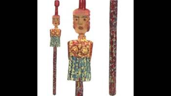 Painted cane of Dolly Parton by artist Carl McKenzie, 1989. (1905-1998.) Medium: unknown, 33" X 3-3/4" X 2-1/4." Source: Kentucky Folk Art Center , Kentucky, USA. 1989.8.8.