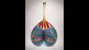 A blown-glass artwork, Sobbing Fire Cleavage , by artist Stephen Rolfe Powell, 2002. (Kentucky, b. 1951.) Medium: Blown glass with murrini; 28" X 23" X 12." Source: Kentucky Artisan Center at Berea , Kentucky, USA.