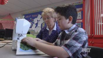 Visiting teaching artist Devonna Hisel visited Sand Gap Elementary to work with third-grade teacher Lisa Young and her students on a quilting project. Students worked on an 8-by-11 landscape quilt using a sewing machine, and Hisel describes how she relates the project to the students’ Appalachian heritage. Young details her plans for next year’s art club and talks about what students gain from art.