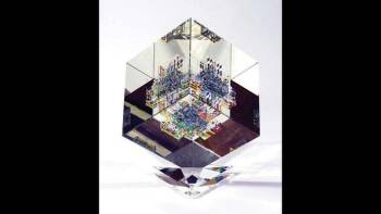 Glass cube sculpture, Star Cluster, by artist Jon Kuhn, 1993. (American, b. 1949.) Medium: Ground, polished, and laminated optical and lead glass; 22" X 22" X 22." Source: A Gift of a Friend of the Museum; Owensboro Museum of Fine Art, Kentucky, USA.
