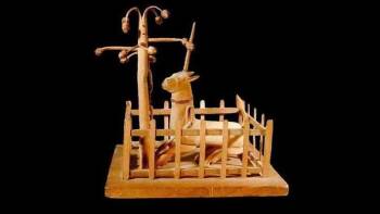 A carved wood sculpture of a unicorn in the garden by artist Edgar Tolson, 1973. (Kentucky, 1904-1984.) Medium: Unpainted wood carving; 13" X 11-1/2" X 14." Source: Owensboro Museum of Fine Art , Kentucky, USA.