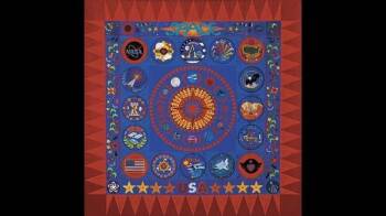 NASA mission patch inspired space quilt, 2003, by artists Pat Holly (Michigan, b. 1953) and Sue Nickels (Michigan, b. 1954). Medium: Cottons; machine-pieced, machine-appliquéd, and machine-quilted; 87" X 87." Source: The National Quilt Museum, Kentucky, USA. 2004.01.02.