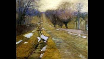 An oil painting of winter in Bucks County near New Hope, Pennsylvania by artist Edward Willis Redfield, 1898. (American, 1869-1925.) Medium: Oil on canvas; 24-1/4" X 29-1/2." Source: Gift of Mattie Schmidt Bowyer in memory of her husband, Charles Henry Bowyer, University of Kentucky Art Museum, Kentucky, USA. 46.1.12.