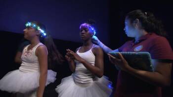 The SciGirls put together all the parts of their program, and test their Sphero and Arduino code with the dancers in a dress rehearsal. The girls find some problems with their program that need to be debugged, and work together to make sure everything is ready for the final performance.