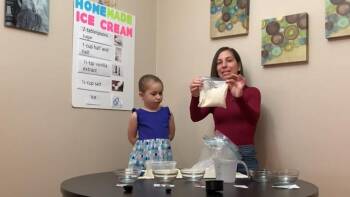 In this video from Let's Learn , Gabriella Sunderland and her daughter show students how to make homemade ice cream with a plastic bag. They follow a recipe and use five different ingredients.