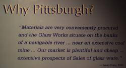 America's first colony, Jamestown, initiated glass production with the hope that it would be an important product in the mercantile trade with the mother country. Although, the production of glass was successful, the quality did not measure up against that of British producers and the glass business soon waned in Jamestown. At the end of the eighteenth century, Pittsburgh found that it had all of the raw materials to make high quality glass and imported skill glass blowers from England to begin full production. So glass preceded the production of steel and became Pittsburgh's first large scale industry.