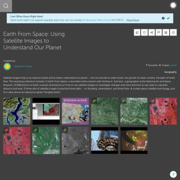 Satellite images help us to observe trends and to better understand our planet -- the rise and fall of water levels, the growth of urban centers, the path of forest fires. This teaching collection includes: 1) Earth From Space, a recorded online session with Andrew K. Johnson, a geographer at the National Air and Space Museum; 2) Reflections on Earth, a poster and lessons on how to use satellite images to investigate changes over time and how to use scale to calculate distance and area; 3) three sets of satellite images to practice these skills -- on flooding, urbanization, and forest fires; 4) a video about satellite technology, and 5) a video about an interactive globe (Tangible Earth).