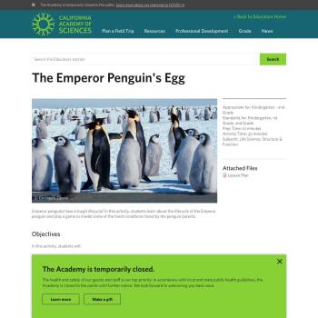 Emperor penguins have a tough lifecycle! In this activity, students learn about the lifecycle of the Emperor penguin and play a game to model some of the harsh conditions faced by the penguin parents.