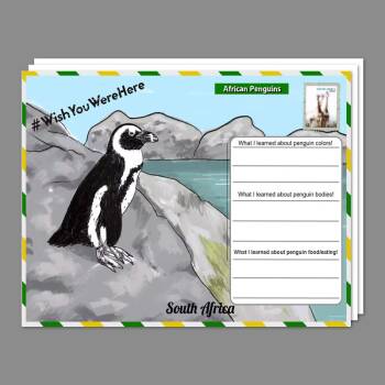 This is the African Penguin Postcard that can by used to help students (PK-2) to record at least one thing they learned about Penguin's coloring, Penguin's Body Parts, and Penguins Food or Eating Habits. This is used as a summative activity in which students write down simple one or two word responses by copying from the answers recorded on the board, or can verbally respond and have assistance from the teacher, a parent aid, or instructional aid to fill in their responses before mailing home to their parents. (This item was shared by the website Treehugger - Sustainability for All at: https://www.treehugger.com/pla...)